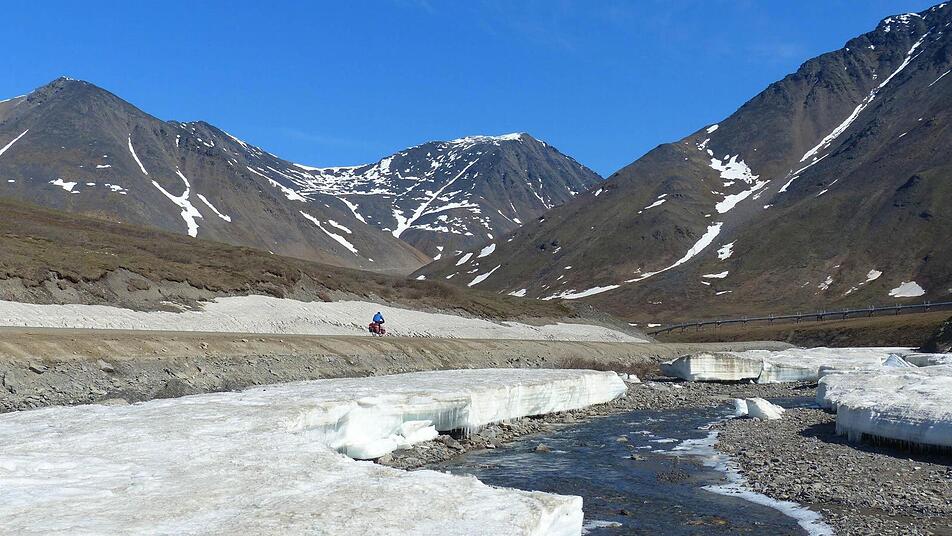 Doch das Wetter in Alaska ist extrem unbeständig: Einen Tag später überfielen bei 20 Grad plus Schwärme von Moskitos die schwitzenden Abenteurer, dann wieder blockierten kilometerlange Schlamm- und Schotterpisten die Räder und röhrende, überholende Trucks nebelten sie mit dichten Staubwolken ein - auf dem berühmt-berüchtigten, legendären