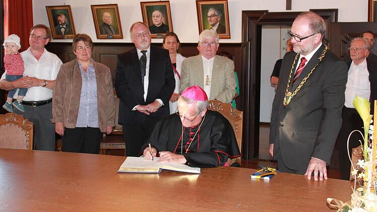 Im Anschluss trug sich der Bischof in das goldene Buch der Stadt ein. Dabei freute sich Bürgermeister Robert Herrmann (CSU) besonders, dass "der 88. Bischof von Würzburg - ich hab's nachgelesen" und Nachfolger der früheren Landesherren Eberns der Kleinstadt die Ehre erweise.