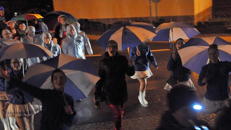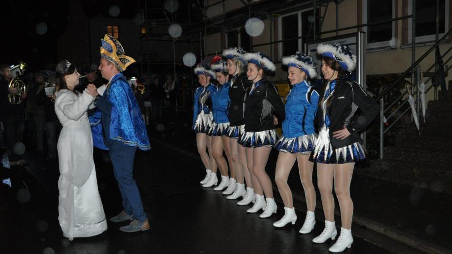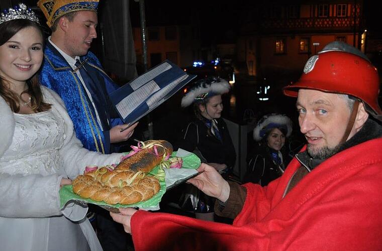 Bürgermeister Ralf Nowak und die Prinzengarde mit Prinz und Prinzessin erwarteten die Besucher vor dem Rathaus und um 19.19 Uhr ging's los mit der Blasmusik Kraisdorf, die schon fast das Ende der fünften Jahreszeit kalendarisch einleitete: "Am Rosenmontag bin ich geboren ..." - und es gab die ersten Schunkler auf der Straße. Das war mal ein stimmungsvoller Faschingsauftakt, gegenüber den eher trockenen Programmen im Sitzungssaal in den vergangenen Jahren.