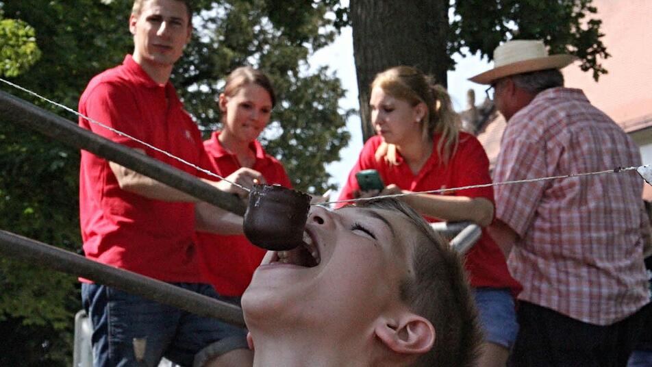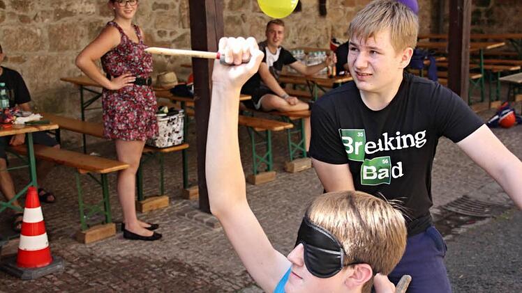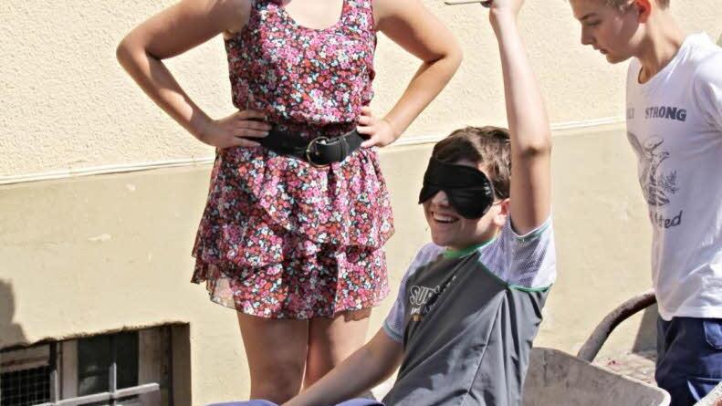 Und dann etwas Angenehmes, weil bei der "Bruthitze" mitunter abkühlend: Erwischt man den Ballon, zwischen Grauturm und Heimatmuseum, bekommt man eine Dusche. Aber erst mal die Dinger erwischen, wenn man in einer Schubkarre sitzt und die Augen verbunden hat! Da musste der Schubkarrenfahrer der Gruppe Kraft und Feingefühl beweisen.