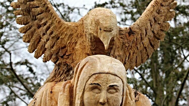 Ihm sei dann die Idee gekommen; eine Skulptur zu schaffen, die auf das Leid syrischer Flüchtlinge hinweist. Klar sei für ihn am Anfang seiner Überlegungen gewesen, eine syrische Frau als Symbol des Leides in Syrien zu schaffen. "Unzählige Bilder habe ich mir im Internet herausgesucht, mit dem Frauenkopf wollte ich auf das Leid in dem Bürgerkriegsland hinweisen." Das sollte aus der Mimik deutlich werden, sagt der Künstler. Die syrische Frau, als Symbol der gepeinigten Zivilbevölkerung ließ ihn nicht mehr los."Nach langen Überlegungen habe ich mit entschlossen mit der Skulptur ein Symbol der Macht, ein Symbol des Leides und ein Symbol des Bösen zu vereinen", sagt der Forstmann. Den Adler, den König der Lüfte, setzt er als kraftvolles Symbol der Macht, als Angreifer aus der Luft, ein. Als Symbol des Bösen fungiert die Schlange.