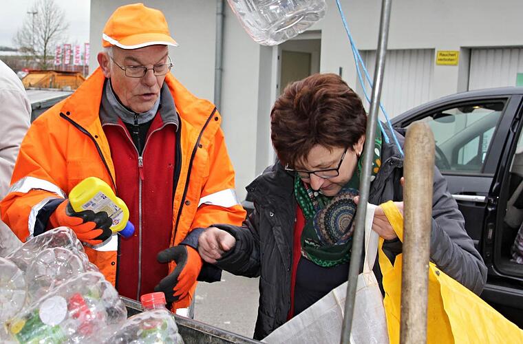 Eine Frau ist damit beschäftigt, den Inhalt ihres Wertstoffsackes in einen Container zu entleeren. Dieser ist aber schon bis zum Rand voll. Es eilt Mitarbeiter Wilhelm Holdorf hinzu und schiebt die Plastikflaschen nach hinten, um Platz zu schaffen. Auch nimmt er die eine oder andere Flasche, die nicht in diesen Container gehört und bringt sie an den richtigen Ort, wobei er entsprechende Erklärungen für die Kundin abgibt.
