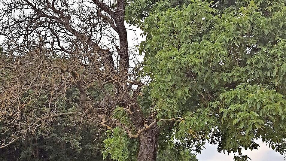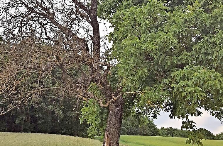 Auf einen Nussbaum hat uns Klaus Barthelmann aus Straßenhof aufmerksam gemacht. Dieser mächtige Baum, der nahe dem Weiler im Eberner Stadtgebiet steht, trägt auf der einen Hälfte sattes Grün, die andere Hälfte ist gänzlich abgestorben. Wie kommt es zu einem solchen Erscheinungsbild?