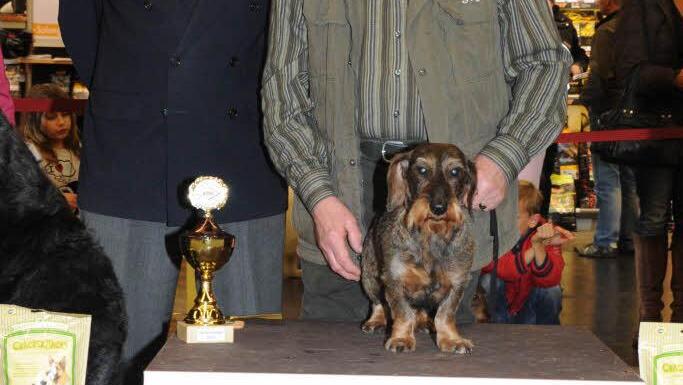 Konkurrenz Im Ehrenring zeigten 20 Hunde vom Berner Sennenhund über Riesenschnauzer bis zum Setter dann, dass sie sich auch im "Alter" noch hervorragend präsentieren. Sechs Hunde kamen in die Endausscheidung und "Gero" war dabei. Groß war die Freude bei Reinhold Meyer und Ehefrau Irmi als der Richterspruch verkündet wurde: "Der Kleinste war der Größte - auf Platz 1 der Rauhhaardackel", jubilierten die Hundezüchter.