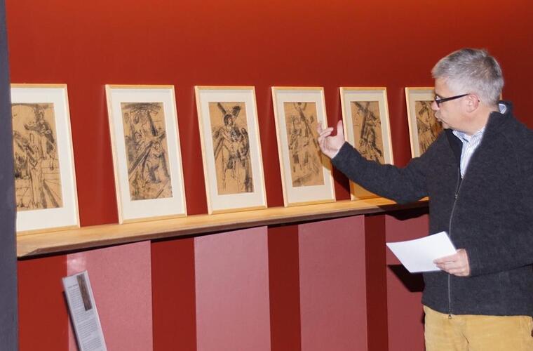 Vor der eigentlichen Versammlung führte Stephan Eschenbacher durch die Rückel-Ausstellung, die derzeit in Haßfurt gezeigt wird. Auch der Verein "Bibelwelten" ist dabei; im Bibelkeller sind zahlreiche Zeichnungen des Haßfurter Künstlers zu sehen, der vor 100 Jahren geboren wurde.