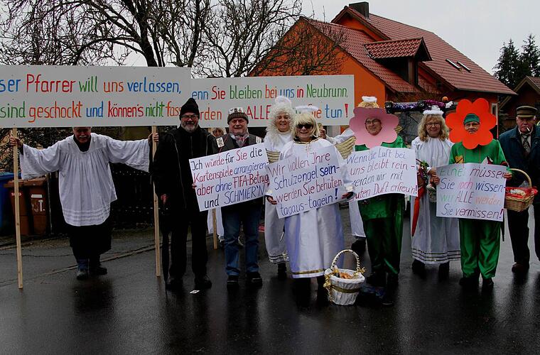 Der Freizeitchor Neubrunn und seine Engel beschäftigten sich in vielen Sprüchen mit dem Abschied von Pfarrer Wissel und nahm ihn in Schutz: "Unser Pfarrer will uns verlassen, wir sind geschockt und könnens kaum fassen. Wenn sie bleiben bei uns in Neubrunn - würden wir alles für Sie tun." Ein anderer meinte "ich würde für sie Kartenspiele arrangieren, aber ohne Betrug und ohne Schmieren".