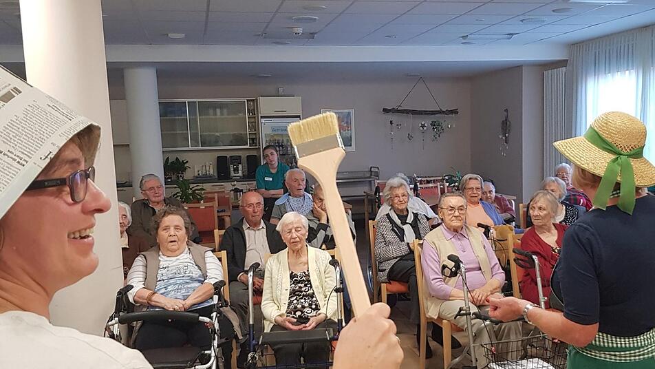 Auf etlichen Gesichtern malt sich aber ein Lächeln. Sie erkennen, was Ilse Morsbach und Christl Pottler vorstellen. "Und wie hat man den Friseur früher genannt?" fragt Pottler weiter: "Booder!", ruft einer. Am liebsten würde der ein oder andere beim Lied über die fleißigen Handwerker mittanzen. Geht nicht mehr. Eines geht, das Lachen: "Wisst ihr," fragt Christl Pottler, "warum es keine Spitzenköchinnen gibt?" - Gespannte Mienen: "Die werden sofort geheiratet!"