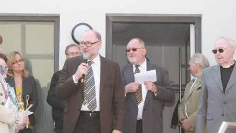 April, so soll es sogar eine Geheimtür zum Pfarrhaus und einen Geheimgang zur Kirche geben, damit Pater Theiler immer trockenen Fußes hin und her pendeln kann", brachte Eberhard Wohl, der Vorsitzende des Kulturrings, die Gemeinde zum Schmunzeln. "Ich wünschte es wäre so" antwortete der Pfarrer und brachte damit die Gemeinde endgültig zum Lachen. Kirchenpfleger Rainer Schor und Bürgermeister Robert Herrmann stellten in ihren Grußworten die Notwendigkeit dieses etwa 250 000 Euro teuren Gebäudes als Fundament für eine lebendige Gemeinde heraus.