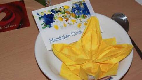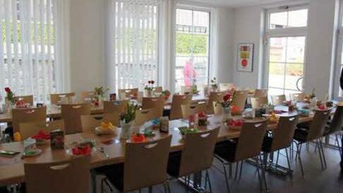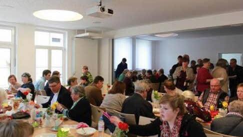 Platznot beim Essen Während der Umbaumaßnahmen war der Seniorenkreis in das evangelische Gemeindehaus umgezogen, vor allem, da im alten Pfarrzentrum die Treppe in den großen Saal für die meisten Teilnehmer zu viel geworden war. Von Barrierefreiheit war dort keine Spur.