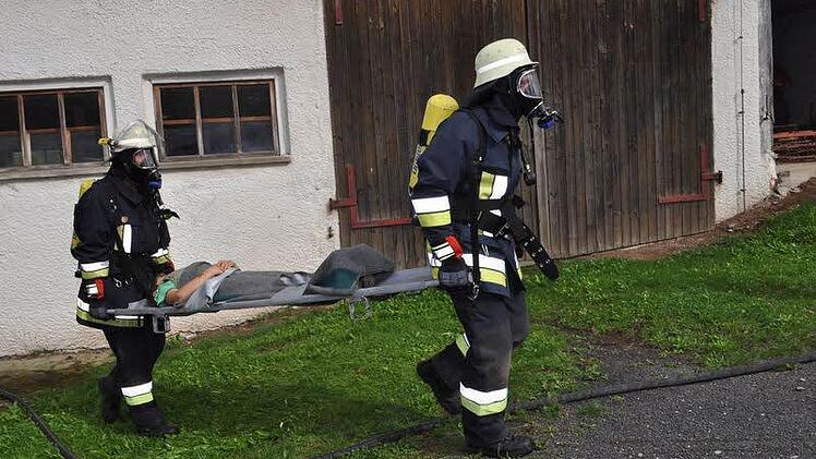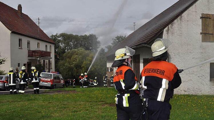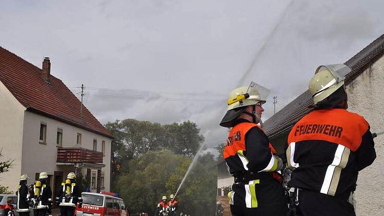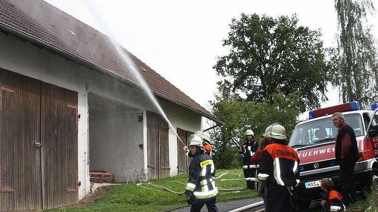 Bei Übung Kinder gerettet Eine gute Gelegenheit dazu hatte die Schauübung am Samstagnachmittag geboten. Bei einem angenommenen Scheunenbrand auf dem Anwesen Andres stellten die fünf Wehren aus der Marktgemeinde Rentweinsdorf ihre Einsatzfähigkeit unter Beweis. Die Rentweinsdorfer übernahmen den Erstangriff und kümmerten sich um die Rettung der beiden "vermissten" Kinder.