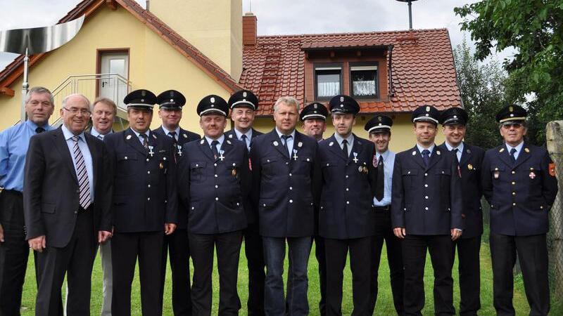 Das Ehrenzeichen für 25 Jahre aktiven Feuerwehrdienst bekamen: Stefan Horn, Walter Pfeu-fer (beide Treinfeld), Bernd Iffland (Gräfenholz), Jochen Rödel, Berthold Zürl (beide Sendelbach) und Thomas Lochner (Ottneuses).