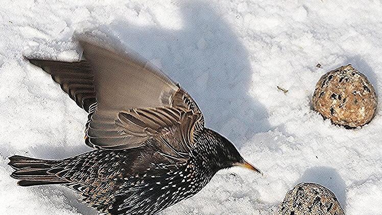 Stare gehören zu den Zugvögeln, aber einige überwintern auch hierzulande in Städten, kommen in den Garten und fressen Äpfel oder Meisenknödel. Die Tiere verachten keine Energiekuchen oder Mehlwürmer. Am Sonntag wurden sie erstmals in diesem Jahr an einem Futterplatz in Unterpreppach gesichtet. Auffällig sind vor allem die großen Schwärme, in denen Stare sich außerhalb der Brutzeit zusammenfinden und spektakuläre Formationsflüge vollführen. Das Gefieder hat eine schwarze Grundfarbe mit violett-grünem Metallglanz. Das Schlichtkleid ist mit weißen Flecken übersät. Foto: Helmut Will