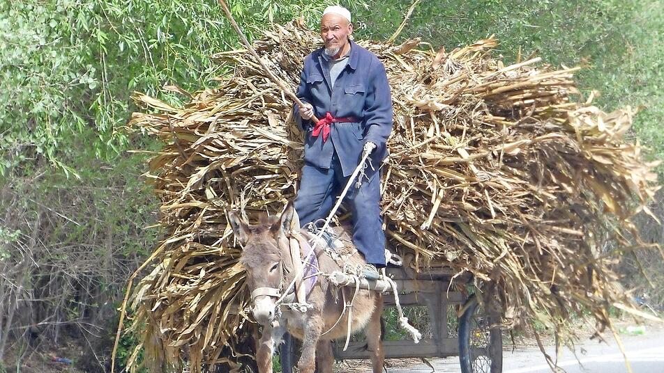 Ab dem chinesischen Kashgar kam Ehefrau Inge dazu. Beeindruckt waren beide vom sogenannten Sonntagsmarkt. Dabei handelt es sich um einen großen Viehmarkt, auf dem Schafe, Ziegen, Esel, Rinder, Pferde und Kamele gehandelt werden. Nach diesem tierischen Erlebnis ging es wieder in die Berge. In Mulden, unter Brücken und eng an Berghängen geschmiegt, suchte das Paar Schutz vor peitschenden Sandstürmen.