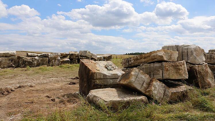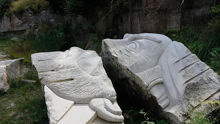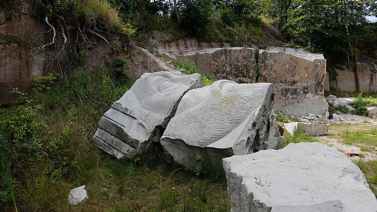 Nicht weit davon entfernt ein weiterer Steinbruch. Hier wird nicht mehr abgebaut. Die Gegend schaut aus wie ein Abenteuerspielplatz. Hier soll einmal ein Steinbruchmuseum entstehen, war zu erfahren. So richtig auffällig ist ein metergroßer Sandsteinkopf, in mehrere große Stücke zerfallen. Ebenfalls geschaffen von der Bildhauerin Steff Bauer und ihrem Freund - ein