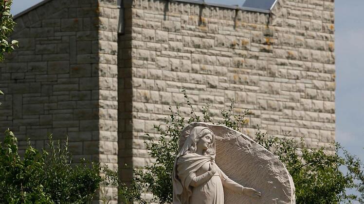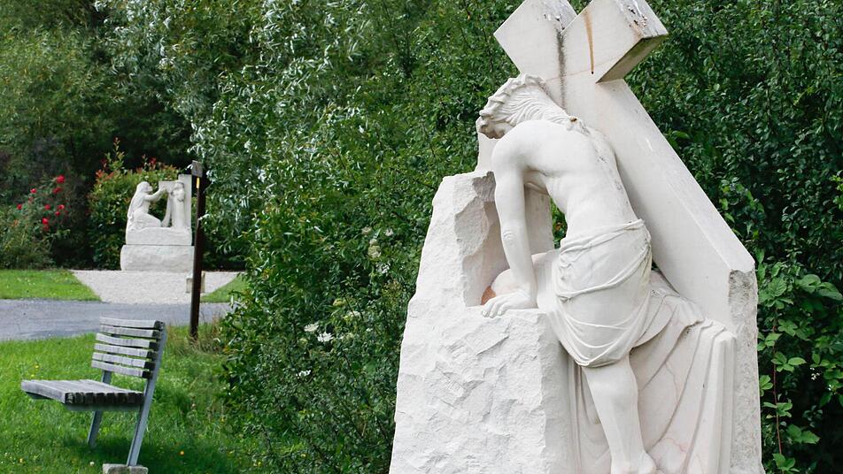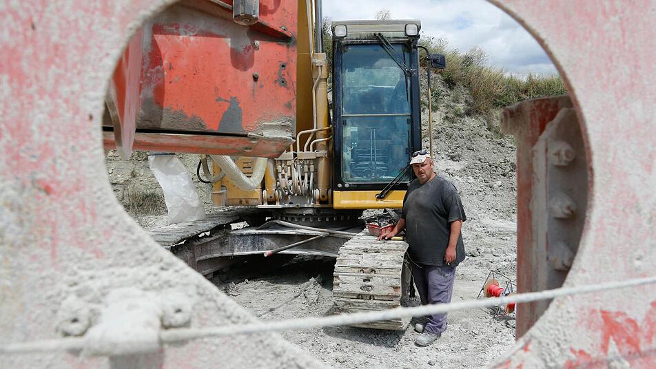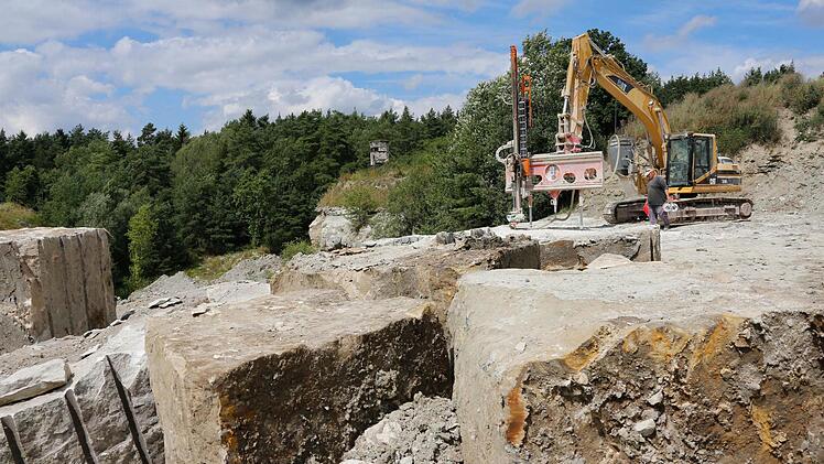 Es geht weiter. Einen neuen Kreuzweg soll es geben. Wir fahren die einzelnen Kreuzwegstationen ab. Laufen würde zu lange dauern. Die erst 2011 eingeweihten einzelnen Stationen sind durchaus beeindruckend. Die Schweinfurter Bildhauerin Steff Bauer setzte auf eine möglichst realistische Darstellung der Figuren, arbeitete mit Findlingen aus den Steinbrüchen rund um Breitbrunn. Wer sich einmal in der Nähe befindet, der Kreuzweg ist einen Abstecher wert. Über einige Feldwege gelangen wir zu einem der Breitbrunner Steinbrüche. Einem, wo noch abgebaut wird. Georg Mühlrath arbeitet hier. Bricht mit seiner Maschine 20-Tonnen-Stücke aus dem Fels. Sandstein, der als Mauerstein ebenso taugt wie für Fassaden oder Gesimse.