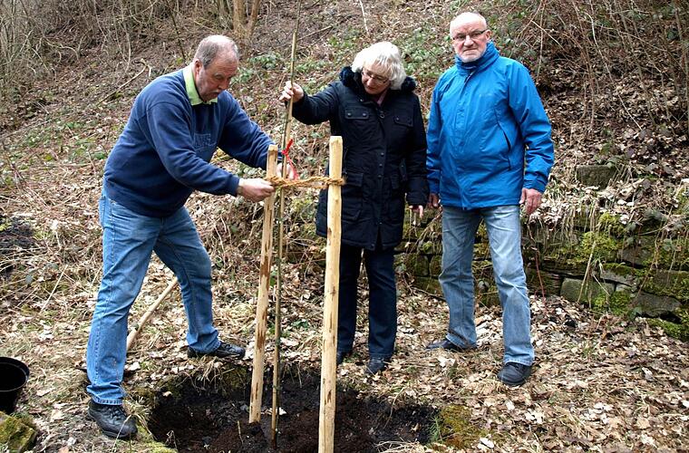 Die "Naturfreunde" pflegen den Brauch, bei den unterfränkischen Bezirksversammlungen ihres Touristenverbandes am Veranstaltungsort einen Baum zu pflanzen. Bei der Tagung im Naturfreundehaus "Warme Sonne" in Zeil hatte der Vorsitzende der Zeiler Ortsgruppe, Nikolaus Zimmermann, auch gleich einen passenden Platz für die Pflanzung gefunden: Zwischen dem Zeiler Heim und der "grünen Hütte", wo früher die Feuerstelle bei den Sonnwendfeiern war. Zimmermann sowie die Bezirksvorstände Marion Both und Werner Brüggemann setzten dort eine Elsbeere in den Boden.