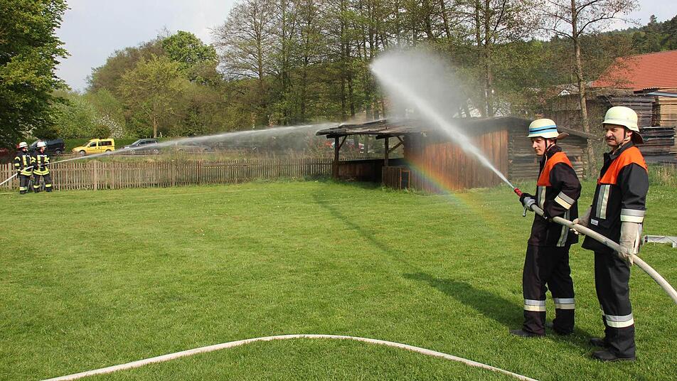 Dann aber zeigte sich das Prinzip der Arbeitsteilung, das sich seit der Zusammenlegung vor zwei Jahren schon bewährt hat. Die Eichelberger starteten den Erstangriff auf die rauchende Holzhütte, während die Reutersbrunner Kollegen eine Wasserwand aufbauten, um ein Übergreifen der Flammen auf die nahen Holzstapel eines Sägewerkes zu verhindern.