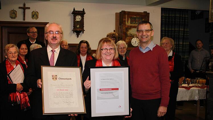 "Und ihr braucht euch nicht zu verstecken" ist Wolfgang Schön, der Vorsitzende des Sängerkreises Bamberg, dem der Gesangverein Ebern angehört, sicher. Er überbrachte vom deutschen Chorverband und vom Fränkischen Sängerbund Ehrenurkunden, die das Engagement des Vereins würdigen. "Bleibt weiter aktiv, zeigt euch in der Öffentlichkeit", gab er Schön den Sängerinnen und Sängern mit auf den Weg. In der Hoffnung, dass es dann auch wieder mit dem Nachwuchs klappt.