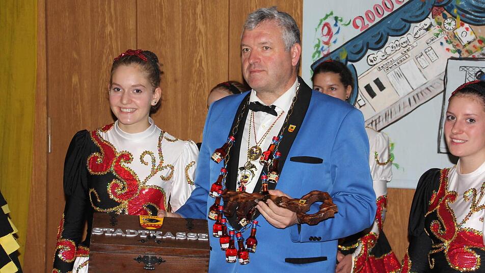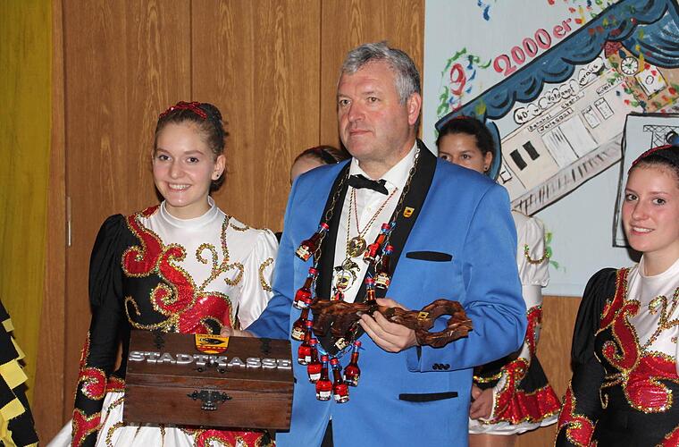 Wie üblich ging es Bürgermeister Jürgen Hennemann (SPD) "an den Kragen." Er wurde von zwei Gardemädels nach vorne geholt, die für ihn die Stadtkasse und den Rathausschlüssel trugen. Diese "Insignien der Macht" musste Hennemann an das "Eberner Schörschla" und den "Schellenmann" herausrücken.