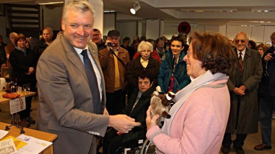 Die Gewinner erhielten aus der Hand des Bürgermeisters jeweils ihre Entwürfe als Postkarten gedruckt.