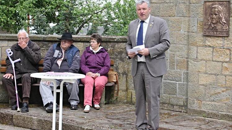 "Maustot" sei ein Jahrhundert lang das Verhältnis von Rückert zu Ebern gewesen. "Erst der mehr rührige und gefühlvolle als kenntnisreiche Hauptlehrer Karl Hoch hat es in den 1920er Jahren wieder angeblasen", so Lipp. Er ging auf "die drei Rückerdenkmale" in Ebern ein - eine Ehrentafel, einen Rückertstein und das Ehrendenkmal.