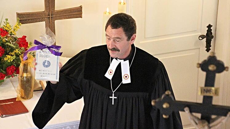 Zu Geburtstagen komme er gerne, sagte Dekan Jürgen Blechschmidt, der die Predigt hielt. Jubilare würden sich über einen Besuch freuen, ein Jubiläum sei stets ein angenehmer Anlass. "Heute besuche ich eine Kirche zum Geburtstag, die Regenschirme, die Sie mitgebracht haben, sehen lustig aus vor der Kirche, schön, dass sie trotz der Wetterunbilden gekommen sind", sagte er. Er fand es schade, dass die Eckartshäuser Kirche nichts erzählen könne.