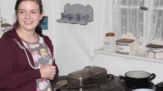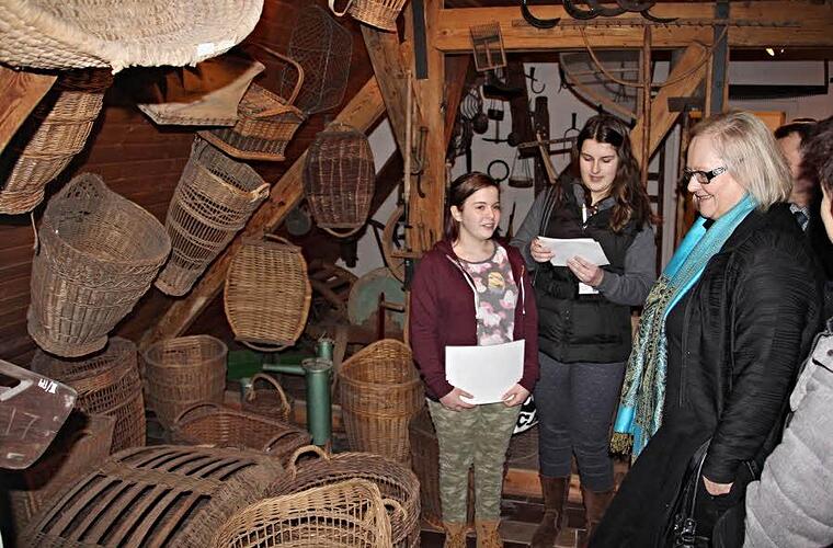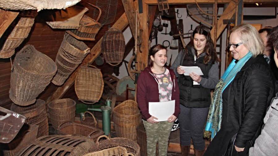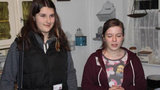 So entführten die 13-jährige Celina Kaiser und die 14-jährige Sandra Rögner ihre Gruppe in die frühere Land- und Hauswirtschaft und zeigten und erläuterten dort Gebrauchsgegenstände zurückliegender Jahrzehnte. Dabei bezogen die beiden Jugendlichen die Interessenten mit ein, indem sie Fragen nach Wert oder Nutzung alter Gegenstände stellten.