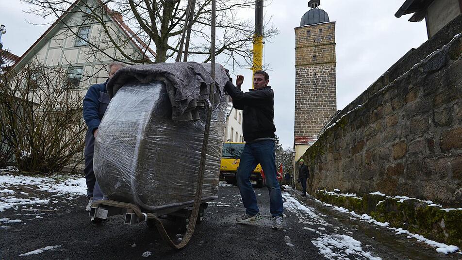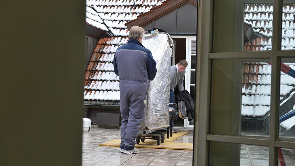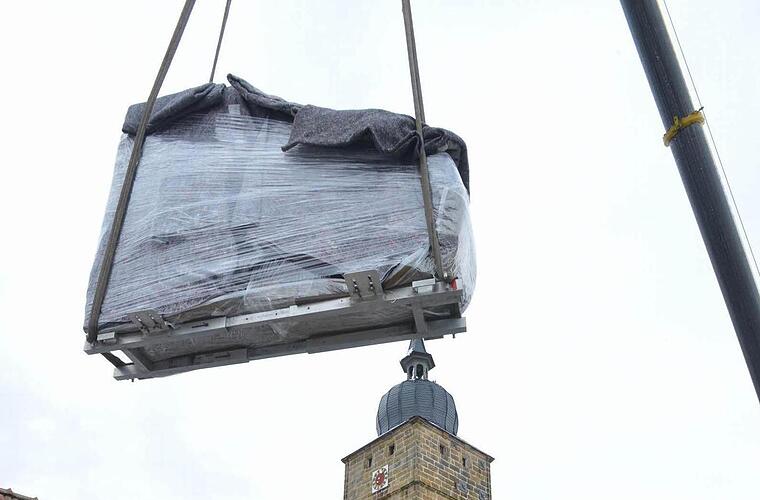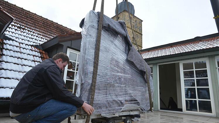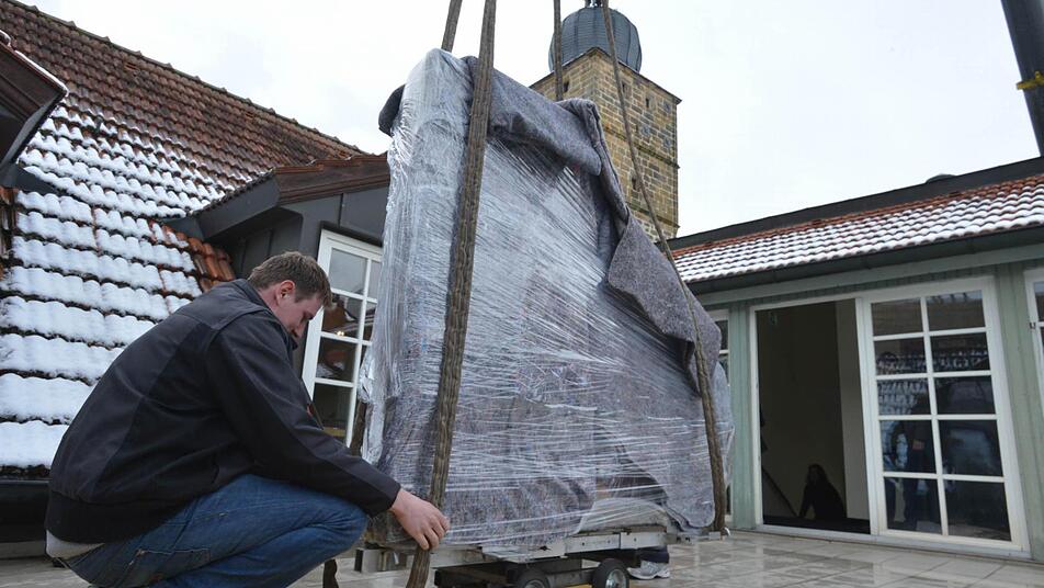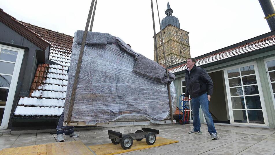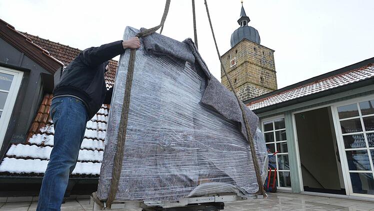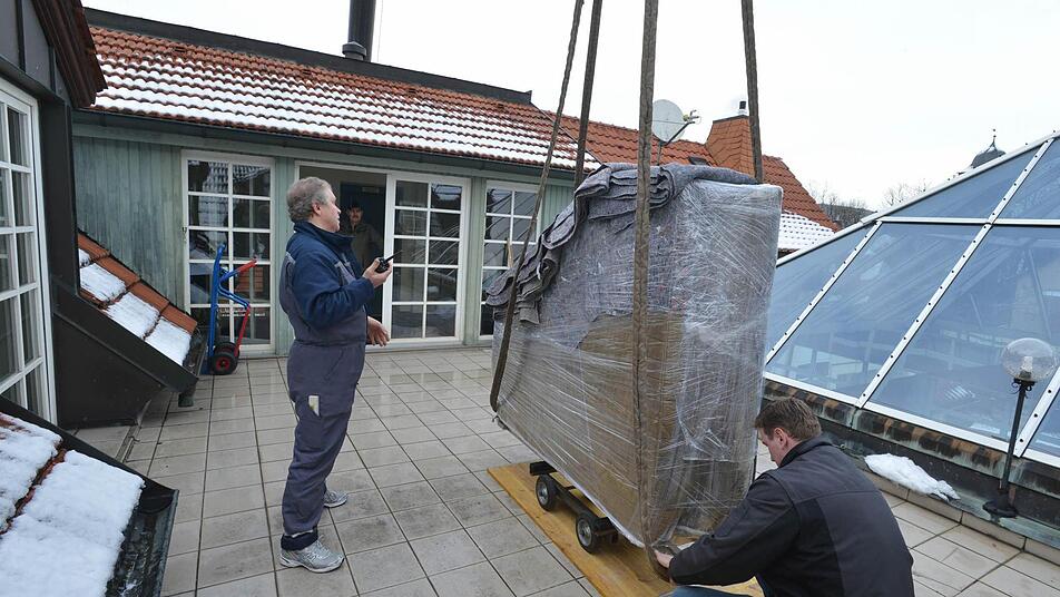 Zusammen mit einem Schwerlastkran eines Subunternehmers aus Dechsendorf rückten Vater und Sohn an, stemmten das acht Zentner Ungetüm, legten es auseinander und packten es sorgsam in Decken und Folien - wohltemperiertes Klavier - ein. "Tragen kann ich sie, spielen aber nicht", scherzte Seniorchef Heinz, als er sich an die Klaviatur setzte, damit Sohn Christian Lyra und Bein abschrauben konnte, ehe der Flügel in Seitenlage gebracht und so von einer Dachterrasse aus an den Haken genommen wurde. Erst Muskelkraft, dann die Hebelwirkung des Krans mit vielen PS.