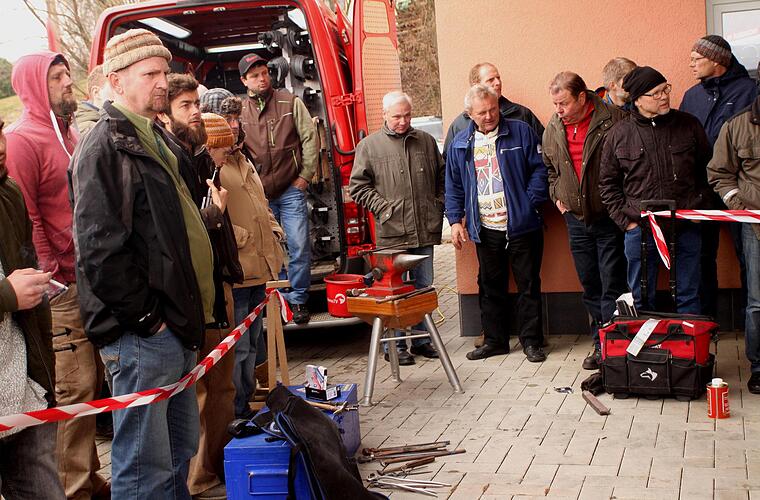 Am Nachmittag zeigte Grant dann, was er am liebsten macht, nämlich das Schmieden. Ihm wurden Pferde vorgeführt, welche es galt, nach seinen Ideen und Vorstellungen zu beschlagen. Und schon hier zeigte sich ein Unterschied zu früher. Ein gelernter Schmied aus Rudendorf erinnerte daran, dass früher ja fast in jeder Ortschaft ein Schmied war und man mit den Pferden dorthin kam, um das Pferd beschlagen zu lassen. Heute ist das umgekehrt. Der ältere Schmied erinnerte sich überdies an einige Unglücke und Verletzungen, wenn man vom Pferd an die Wand gedrückt wurde oder auch durch Hufausschlag verletzt wurde. Nicht jedes Pferd ist nämlich beim Beschlagen zahm. Es muss bis heute dazu erzogen werden, ruhig zu stehen - zur Not braucht es eine Beruhigungsspritze.