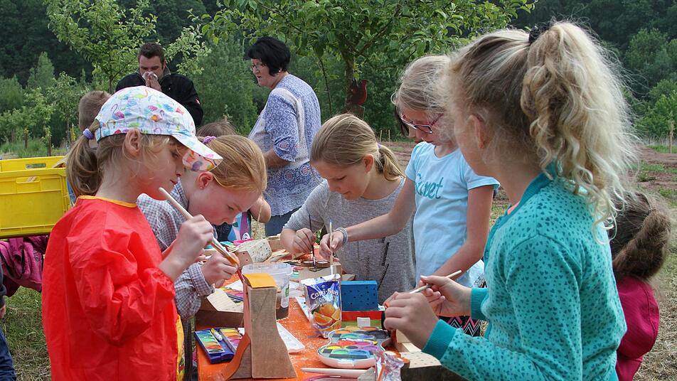 Bei der Bemalung der Bienenbeute wuselte es auch rund um Pfarrer Glockner, denn die Mädchen und Buben der Klasse 3a durften das Klassenzimmer an diesem Tag verlassen und selbst mit aktiv sein. Unter der Leitung ihrer Lehrkräfte und des Holzschnitzers und Farbenspezialisten Sebastian von Zülow bastelten auch sie kleine Insektenhotels, indem sie in ihr Holzstück kleine Löcher bohrten und ihr Haus dann auch noch bunt bemalten.