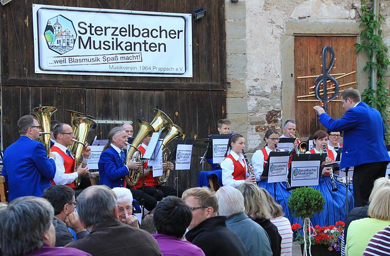 Bei herrlichem Pfingstwetter bescherten die Sterzelbacher Musikanten aus Prappach zum achten Mal einen schwungvollen "Abend für die Blasmusik" im idyllischen und in der Dämmerung wunderbar illuminierten Pfarrhof.