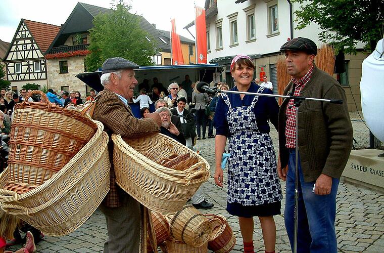Typische Szene nachgespielt Noch vor der Enthüllung des "Raaser"-Denkmals spielten Rudi Ruppstein, ein eingefleischter Sander Korbhändler, sowie Karin und Ralf Wagner eine Szene nach, wie früher die Haustürgeschäfte der "Korbraser" abliefen. Die Enthüllung der Bronzestatue nahm die Sander Weidenprinzessin Anna Rippstein zusammen mit der Enkelin des Künstlers Theo Steinbrenner vor. Pfarrer Michael Erhart und Pfarrer Hans-Christian Neiber erbaten den Segen für das Kunstwerk.