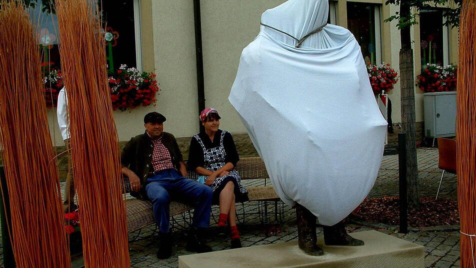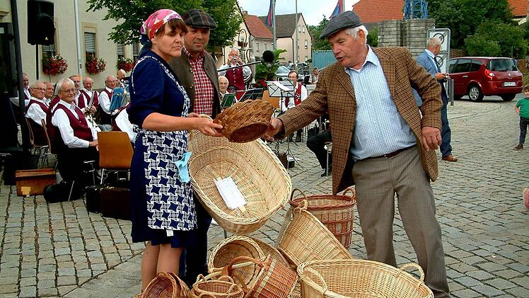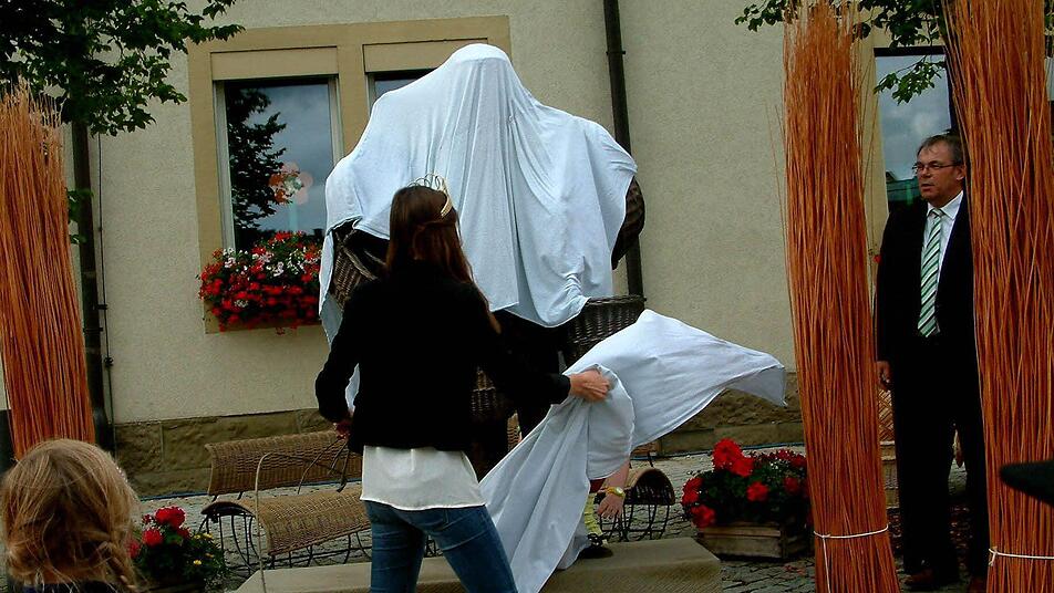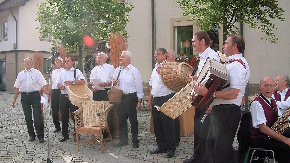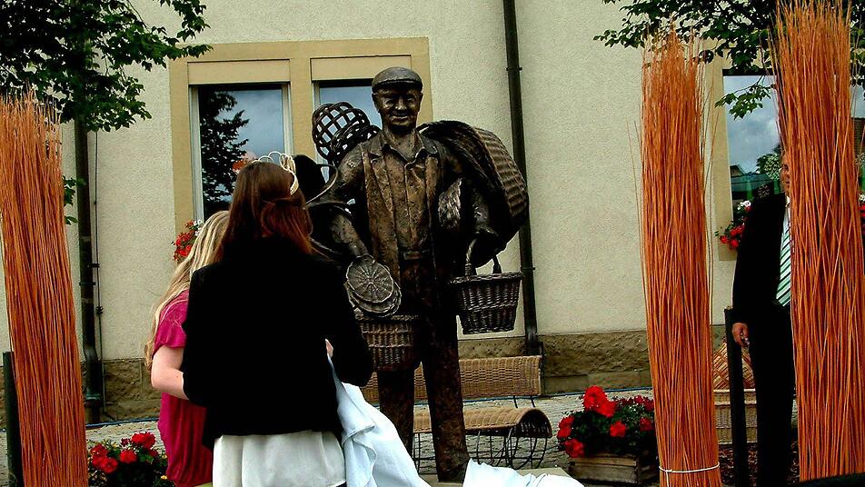 Die von Theo Steinbrenner geschaffene Figur des "Korbraasers"wurde feierlich enthüllt. das Denkmal erinnert an die alte Handwerkstradition in der Gemeinde, die Sand am Main in ganz Deutschland bekannt gemacht hat.