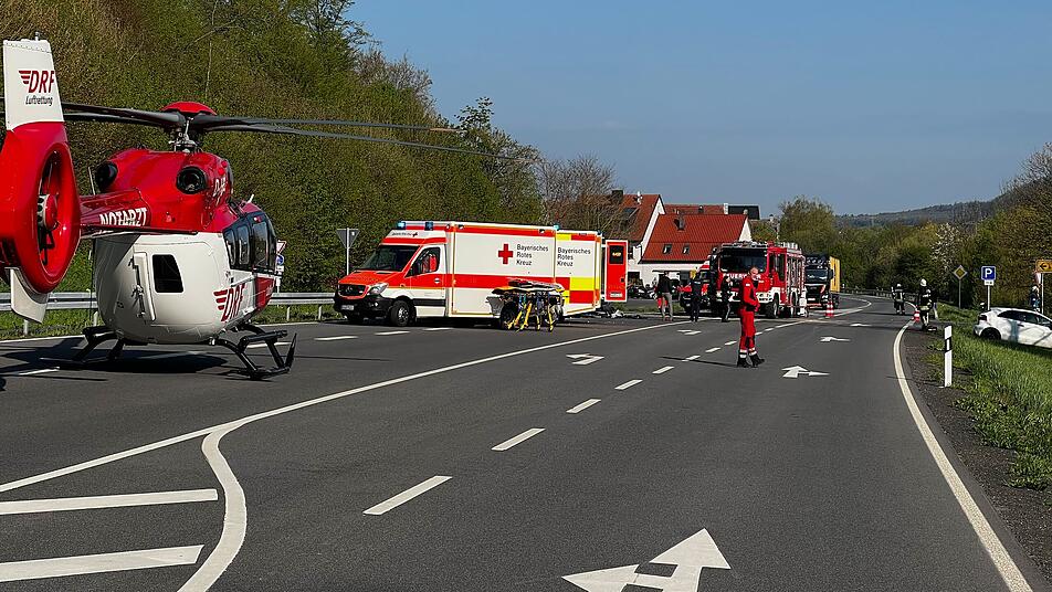 Zwei Rettungshubschrauber sowie Feuerwehr und Polizei sind im Landkreis Haßberge wegen eines schweren Unfalls im Einsatz: Ein 21-Jähriger stieß mit einer 43-Jährigen zusammen, insgesamt gibt es fünf Verletzte. Die betroffene Straße ist weiterhin gesperrt.