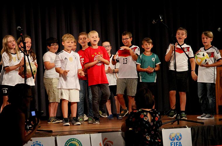 Mit Respekt vor dem Ausrichterland spielten die Flötengruppen dann zwei russische Lieder mit der "Russischen Melodie" und dem "Russka". Sie wurden dabei begleitet von Selina Knoblach auf dem Klavier. Völlig anders dann die Klasse 3a mit ihrem Rap "Wir wollen siegen", in dem sie in ihrem Sprechgesang die Ziele vorgaben: "Fußball WM - wir wollen siegen! Wir holen uns den fünften Stern, denn das wollen wir alle gern! Wir wollen siegen. Lauf dem Ball schnell hinterher, denn das ist gar nicht schwer", hieß es da. Die Moderatoren lenkten nach der Pause dann auf eine Mannschaft über. "Sie merken schon, bei aller Sympathie, die wir für die anderen Fußballmannschaften haben, haben wir an unserer Grundschule doch einen eindeutigen Favoriten: Wir wollen, dass Deutschland wieder Weltmeister wird!" Und deswegen war der zweite Teil des Liederabends der deutschen Nationalmannschaft gewidmet.
