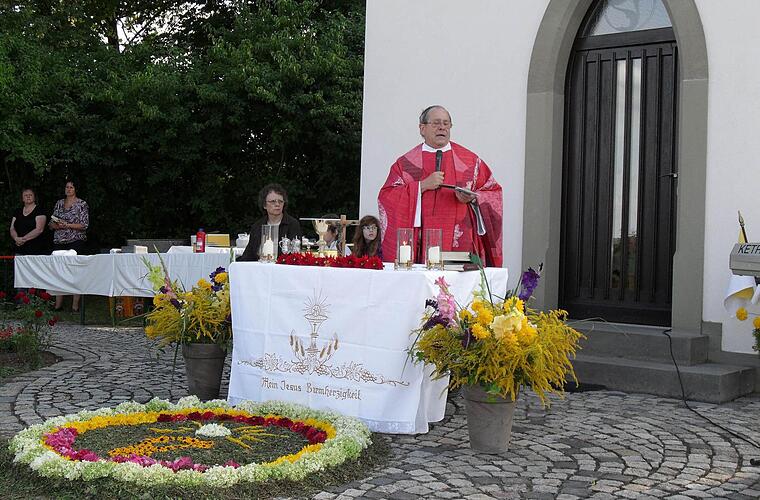Kleiner Pilgergang am Gedenktag des Heiligen Cyriakus Zum Ehrentag der Heiligen Cyriakus, dessen Gedenktag etwa in der Hälfte des Nothelfer-Zyklus gefeiert wird, hat die Pfarrei Eltmann diese kleine Wallfahrt installiert. Die Frauen aus Eschenbach hatten für den Gottesdienst wieder einen besonders schönen Freialtar mit Blütenteppich vor der Kapelle gestaltet.
