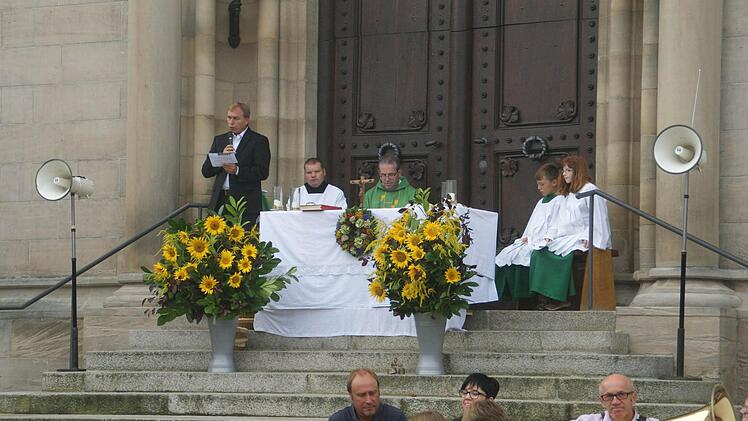 Nebel über dem Marktplatz Zwar lag zu Beginn des Freiluftgottesdienstes an der Stadtpfarrkirche noch Nebel über dem Marktplatz, doch zum Schlusssegen ließ sich die Sonne schon erahnen, und es begann ein strahlend schöner Markttag.