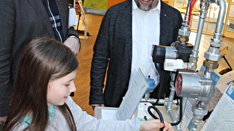 Als sie an den Umwälzpumpen den Stecker in die Dose steckt um diese "summen zu lassen", blicken ihr Bürgermeister Jürgen Hennemann und Rektor Philipp Arnold von der Mittelschule über die Schulter. So kam es zuem "Schulterschluss" zwischen Politik, Schule und der jungen Schülerin. Wenn das kein gutes Zeichen für die Energiewende ist. Mia störte es nicht, dass ihr "die Großen" bei der "Bedienung" an den Geräten zusahen, die es ihr offensichtlich sehr angetan hatten.