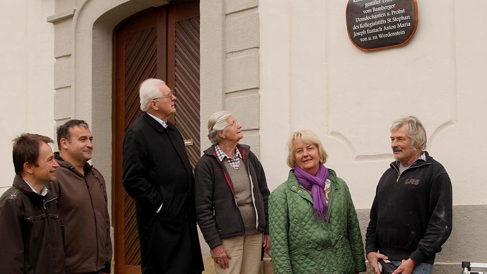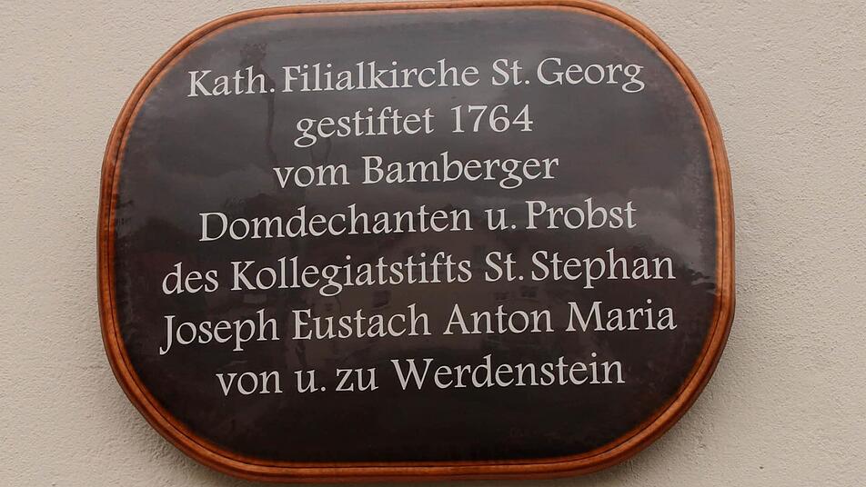 Jetzt ziert die Außenfassade zum Gedenken an den Kirchenstifter auch ein Schild mit der Inschrift "Kath. Filialkirche St. Georg, gestiftet 1764 vom Bamberger Domdechanten und Probst des Kollegialstiftes St. Stephan Joseph Eustach Anton Maria von und zu Werdenstein". Es ist eine Stiftung der Geschwister von "Schmitts Erben", die dem Ort seit Jahren verbunden sind.