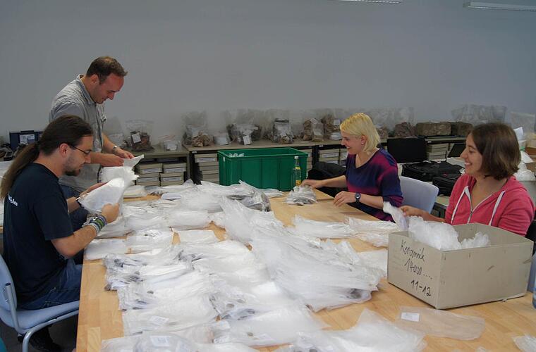 Die Studenten werten bereits die fünfte Feldbegehung seit September 2012 aus. Jeweils im Frühjahr und Herbst, wenn die Acker gepflügt sind, kann Cassitti das Projekt für Archäologie-Studierende anbieten. Mittlerweile gehören Wissenschaftler, die durch Gärten streunen, um Obstbäume zu bestimmen, oder um Felder komische Geräte aufstellen und ständig etwas vom Boden aufheben, für die Fatschenbrunner zum Ortsgeschehen dazu. Komisch beäugt werden die Nachwuchs-Forscher deshalb nur noch selten: "Eine Frau hat mal gemeint, dass wir hier blitzen", sagt Lukas, der neben Archäologischen Wissenschaften noch Geographie studiert, "dabei war die nächste Straße zwei Kilometer entfernt." Daraufhin meint Leonie, die ihm gegenüber sitzt: "Es war ja aber Blitzer-Marathon." Sie steht noch am Anfang ihres Studiums.