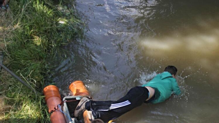 Danach galt es eine "Boje" zu umschiffen und schließlich mussten am Ziel drei Luftballons, die etwa 1,5 Meter über dem Wasser gespannt waren, mit den Händen zum Zerplatzen gebracht werden. Erst wenn das gelungen war, wurde die Zeit gestoppt.