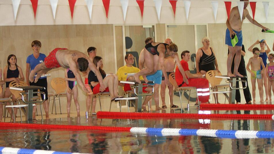Michael Ziegler gab dann auch den Startschuss, mit dem 2. Bürgermeister Harald Pascher und Stadträtin Ulrike Zettelmeier das 24-Stunden-Schwimmen eröffnete, aber dann auch selbst als dritter in das Becken sprang. Die ersten jüngeren Schwimmer konnten es ebenfalls nicht mehr erwarten und schon bald herrschte reger Betrieb auf den Schwimmbahnen.