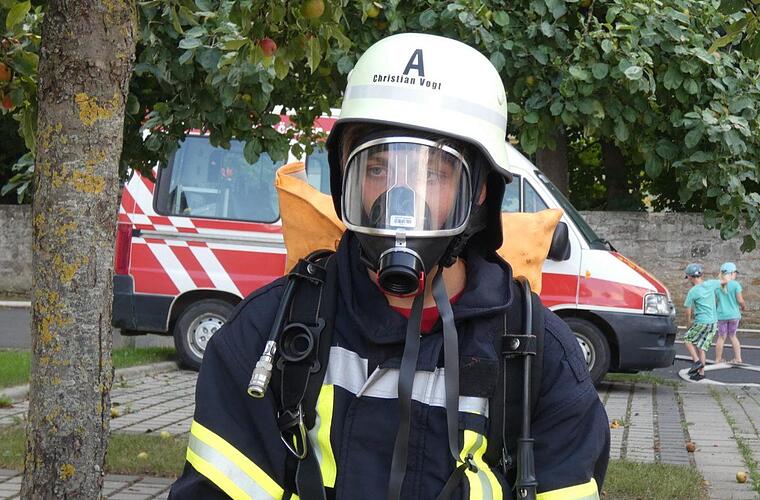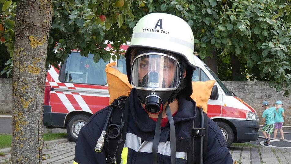 Wissenswertes rund um das Thema Atemschutz vermittelte zweiter Vorsitzender Christian Vogt. In voller Montur mit Überjacke und -hose, Atemschutzmaske, Sauerstoffflasche und Helm zeigte Jugendfeuerwehrler Kilian Nowak welche Kleidung man im Einsatz trägt. Außerdem erfuhren die Kinder im Alter von sechs bis zehn Jahren, dass jeder Atemschutzträger einmal im Jahr im Atemschutzzentrum Knetzgau eine Belastungsübung bestehen muss.