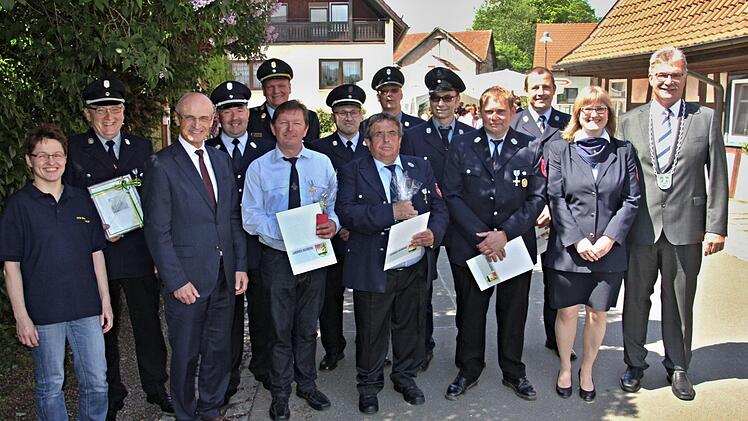 Der Landrat zeichnete zusammen mit dem Bürgermeister und Kreisbrandinspektor Thomas Habermann die Wehrleute aus. Dies waren: Reinhold Storath, Gleusdorf, Franz Nick,
