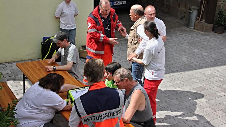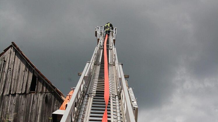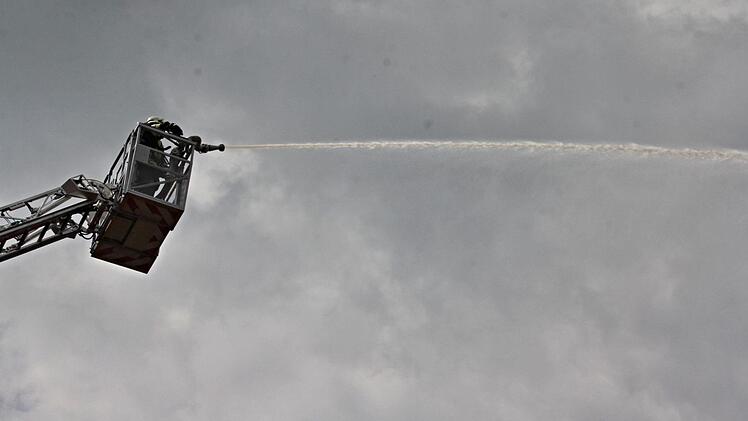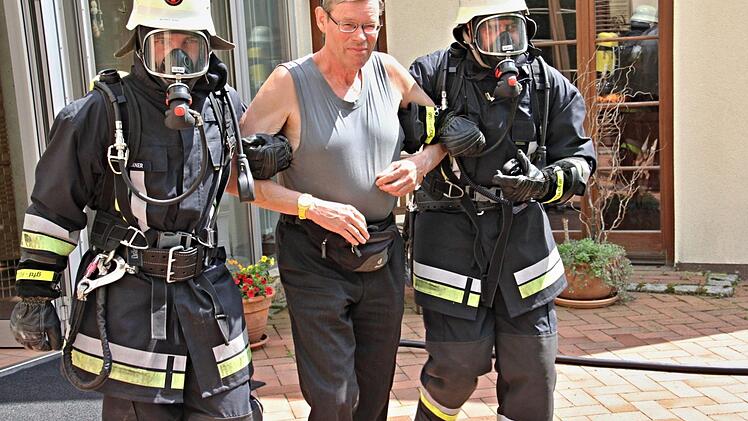 Nach und nach rückten die Wehren aus den Ortschaften der Gemeinde Untermerzbach an. Sie wurden vom örtlichen Kommandanten, Rainer Schramm, in Empfang genommen, der sie in ihr Aufgabengebiet einwies. Es dauerte nicht lange, bis aus den ersten Strahlrohren das Wasser am Michelshof schoss. Relativ schnell zur Stelle waren auch Atemschutzträger, galt es doch aus dem Gebäude Personen zu retten. Auch mittels einer Leiter verschafften sich die Feuerwehrleute von außen Zugang ins Gebäude. Mit von der Partie war die BRK-Bereitschaft Untermerzbach unter Leitung von Leitendem Notarzt Dr. Ingo Schmidt-Hammer. Zu ihm wurden die Verletzten gebracht und er nahm sie unter seine Fittiche, stellte Diagnosen, leistete erste Hilfe und bestimmte, wohin die geretteten Personen gebracht wurden. Blicke zog die Feuerwehrleiter der Feuerwehr aus Ebern auf sich, die etwa 30 Meter ausgefahren wurde und hoch über den Dächern begann der "Mann im Korb" mit guter Übersicht mit der Brandbekämpfung. Zahlreiche Schaulustige, unter ihnen auch Bürgermeister Helmut Dietz, ließen den Einsatz der Feuerwehrübung auf sich wirken.