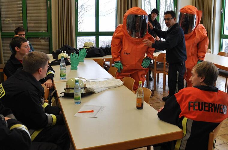 Zwei Tage lang vermittelten mehrere Kreisbrandmeister zunächst eine ganze Menge Theorie. Wichtig war dann vor allem der praktische Teil, in dem die Teilnehmer im CSA-Anzug den Ernstfall probten. Auch erfahrene Feuerwehrleute müssen sich erst an den zusätzlichen Anzug gewöhnen, der über die übliche Atemschutzausrüstung gezogen wird.