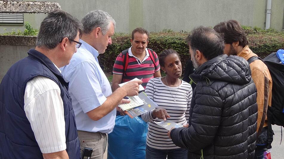 Franz Josef Zeheter spricht nicht arabisch. Franz Hümmer auch nicht. "Welcome to Ebern", muss somit ausreichen. Dann treffen auch Bürgermeister Jürgen Hennemann und sein Mitarbeiter Josef Müller an der Gemeinschaftsunterkunft ein. Der Bürgermeister hat Stadtpläne in der Hand. "Unsere Auszubildenden haben diese in den letzten Tagen vorbereitet. Ärzte, Supermärkte, Spielplätze und alles was man so für das Leben braucht ist darin eingezeichnet", sagt das Stadtoberhaupt, "natürlich auch auf Englisch." In der anderen Hand hält er Gutscheine: "Wir laden unsere Neubürger heute zum Essen in die AWO ein."