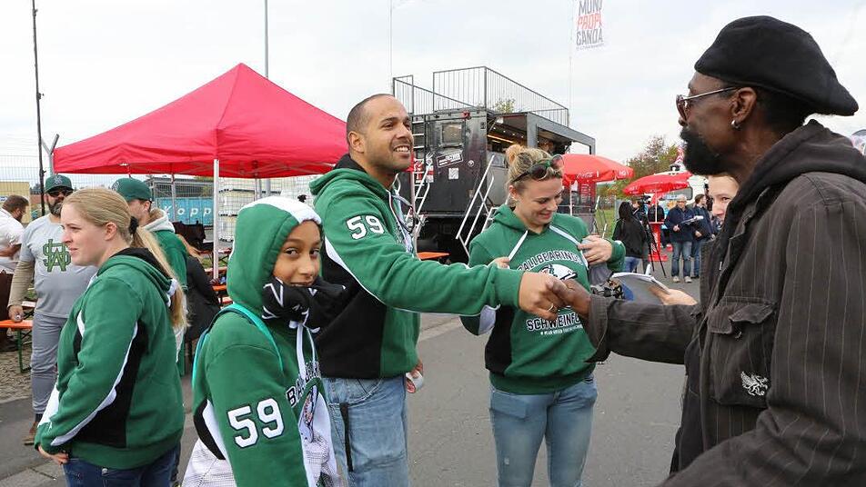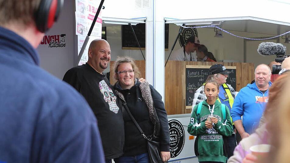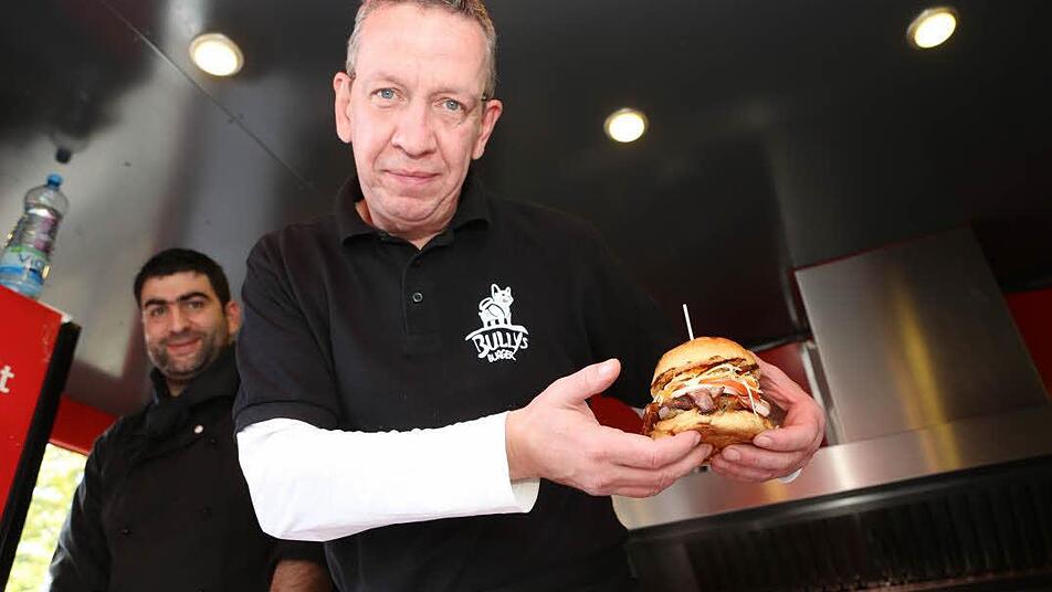 Viele kenne er bereits aus Nürnberg. "Manches habe ich sogar schon von Anfang an mitgetestet", sagt er. Stargast Jumbo Schreiner ist von dem Food-Truck-Battle im beschaulichen Knetzgau begeistert. "Es sind so schnuckelige Stände, und es ist auch immer mal was Neues dabei."