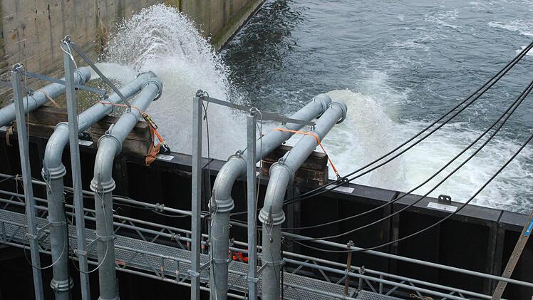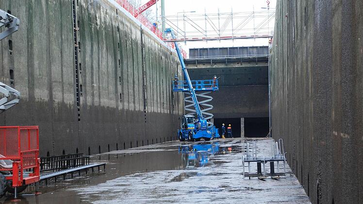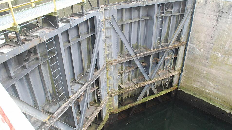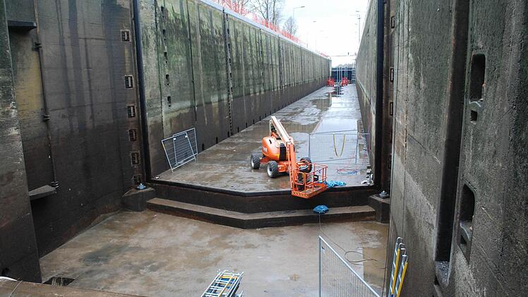 Wer die Schleuse, mit einem Hub von 7,60 Metern die größte auf dem Main, im wässrigen Zustand kennt, wird jetzt schier erschlagen von den Dimensionen des leeren Betonbeckens: Weil zwei der drei Tore ausgewechselt werden, muss das Wasser raus, rund 40 Millionen Liter. Wie ein Grand Canyon aus Menschenhand klafft das zwölf Meter tiefe, elf Meter breite und 300 Meter lange Loch mit den Betonwänden in der Auenlandschaft.