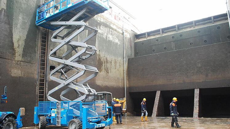 In der Schleuse Ottendorf (Gemeinde Gädheim) werden die Tore ausgetauscht, zum ersten Mal seit 1962. Deswegen kann man jetzt trockenen Fußes durch das gewaltige Betonbecken spazieren. Das ist im Moment Frankens größte Baustelle.